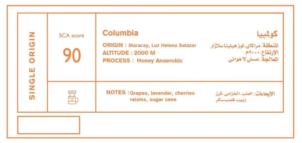 من المزارع الكولومبية، تنبض هذه القهوة بطابعٍ عطريّ رقيق يعكس عناية المزارع ودقّة المعالجة, ففي كل رشفة، تتداخل إيحاءات العنب والكرز والزبيب وقصب السكر مع لمسةٍ خفيفة من الخزامى تُضفي على الفنجان طابعًا زهريًا ناعمًا وحلاوةً لطيفة.